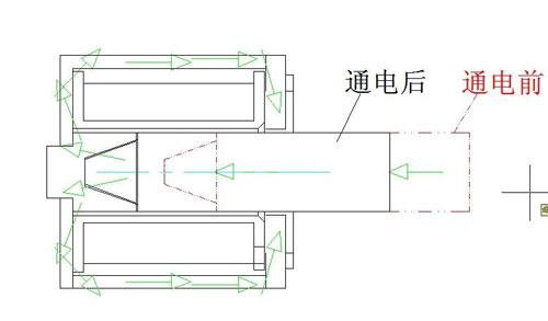 推拉式電磁鐵中間的滑動(dòng)鐵芯,線圈通電后產(chǎn)生磁場,磁場將鐵芯磁化,鐵芯形成疊加磁場,磁力線由一極向另一極運(yùn)動(dòng)時(shí)產(chǎn)生力,鐵芯的一端可以帶動(dòng)一個(gè)物體做位移運(yùn)動(dòng),進(jìn)而實(shí)現(xiàn)一個(gè)功能動(dòng)作。